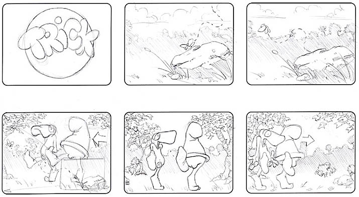 Storyboard for a work in progress animation of Vaughn Bode's Cheech Wizard strip "Trick"